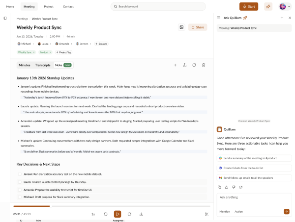 Quill Meetings was initially launched as an AI-powered meeting and note-taking tool. As the company expanded its vision toward building a broader “AI Chief of Staff” platform designed to automate knowledge workflows, the existing product experience required a significant transformation.