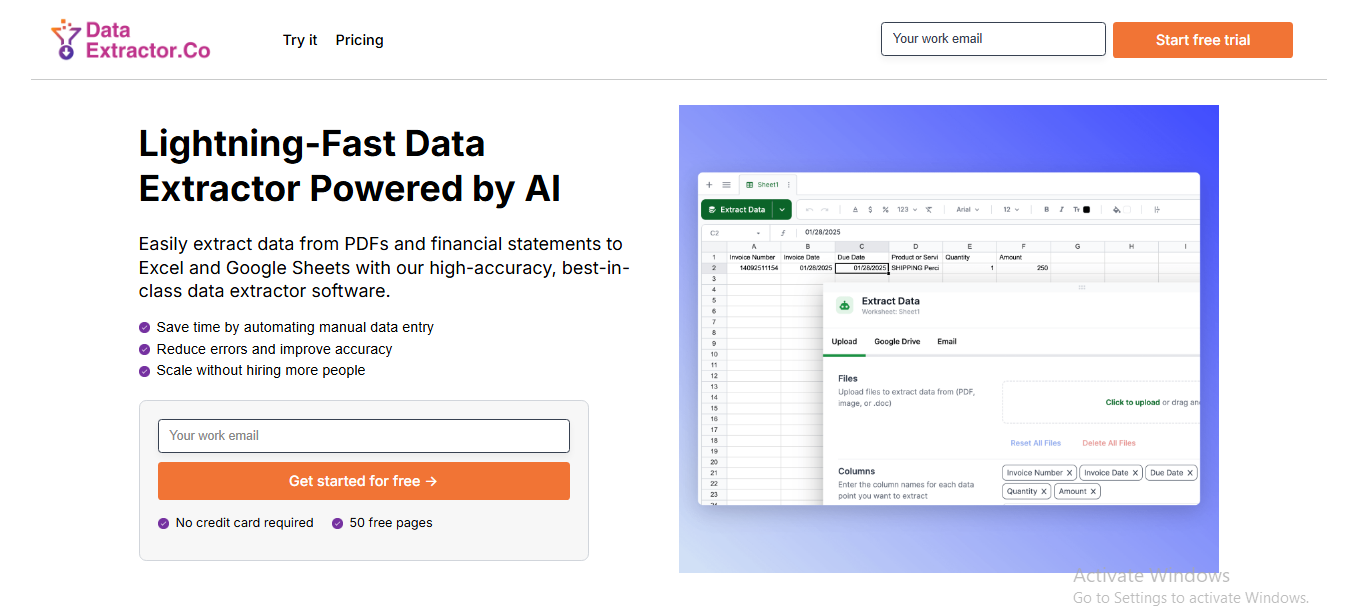 DataExtractor.co AI technology operates without templates or the need for special setup, and it works with various document types out of the box. AES-256 encryption is used to protect all data, and customer files are never used to train the AI.