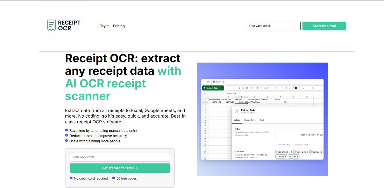 ReceiptOCR.co is an artificial intelligence-driven platform that captures receipt PDFs and images into organized spreadsheets. Designed for operations and finance teams, it processes receipt entry with high precision, efficient processing, and robust data security.